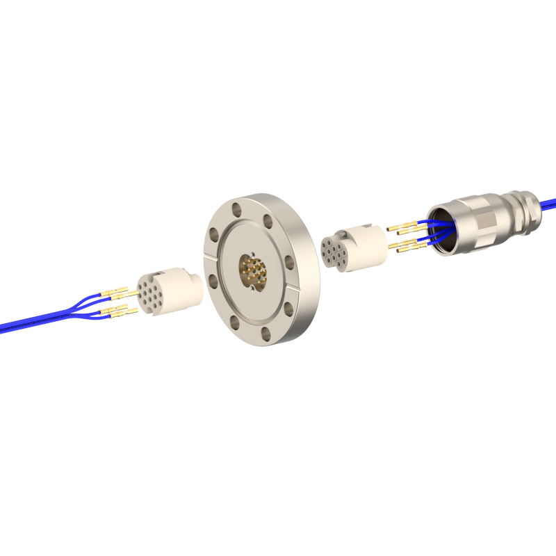 lPlugs are provided on both the vacuum and atmospheric sides, allowing easy plugging/unplugging for simple assembly and wiring. The plugs feature a keyed (polarized) design to prevent misinsertion and are made of low‑outgassing materials, making them suitable for high‑voltage (HV) environments.