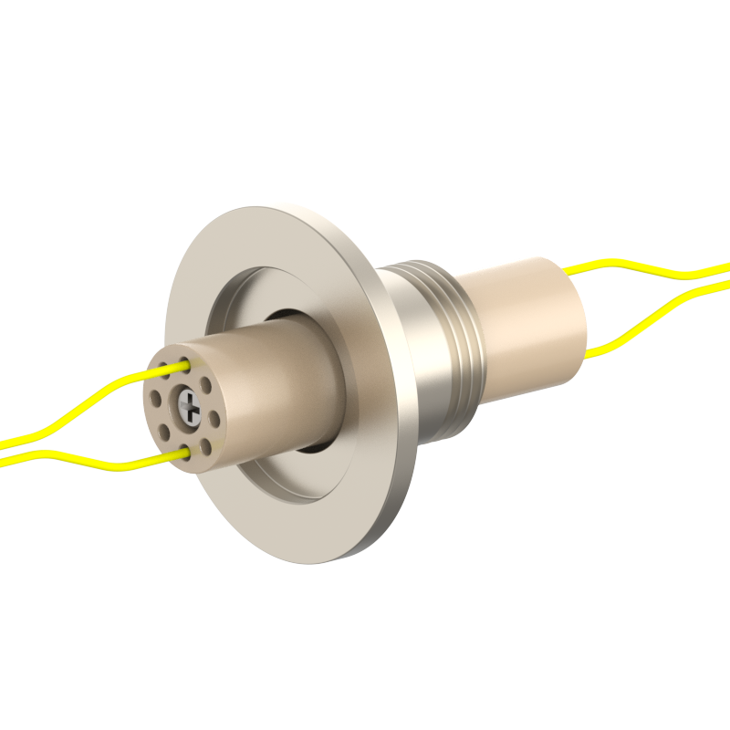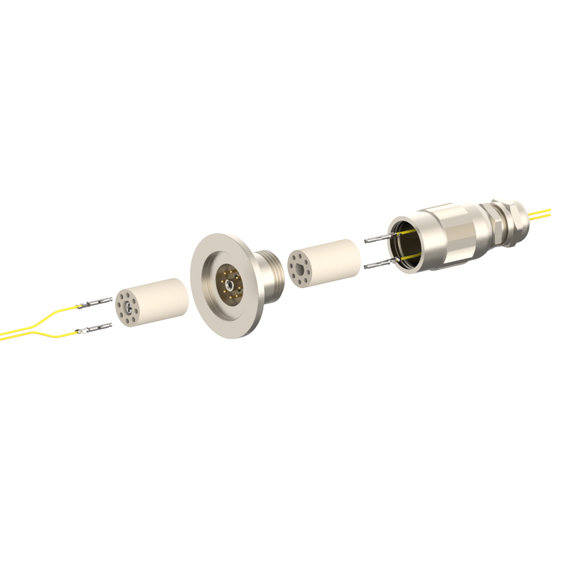 lPlugs are provided on both the vacuum and atmospheric sides, allowing easy plugging/unplugging for simple assembly and wiring. The plugs feature a keyed (polarized) design to prevent misinsertion and are made of low‑outgassing materials, making them suitable for high‑voltage (HV) environments.