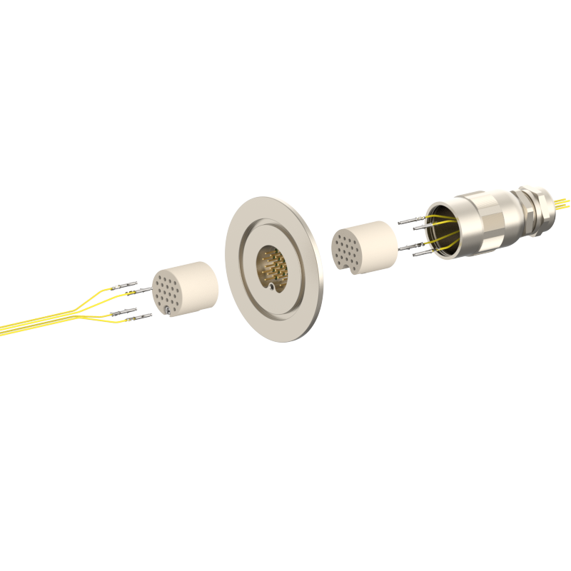 lPlugs are provided on both the vacuum and atmospheric sides, allowing easy plugging/unplugging for simple assembly and wiring. The plugs feature a keyed (polarized) design to prevent misinsertion and are made of low‑outgassing materials, making them suitable for high‑voltage (HV) environments.