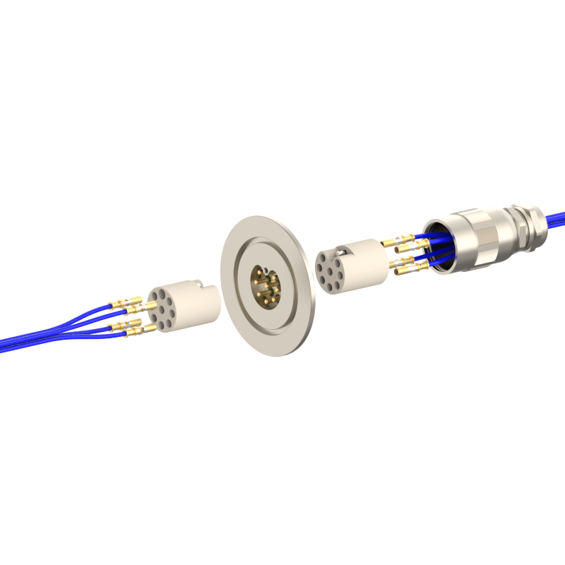 lPlugs are provided on both the vacuum and atmospheric sides, allowing easy plugging/unplugging for simple assembly and wiring. The plugs feature a keyed (polarized) design to prevent misinsertion and are made of low‑outgassing materials, making them suitable for high‑voltage (HV) environments.