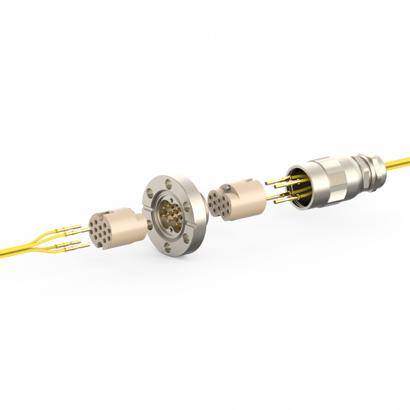 lPlugs are provided on both the vacuum and atmospheric sides, allowing easy plugging/unplugging for simple assembly and wiring. The plugs feature a keyed (polarized) design to prevent misinsertion and are made of low‑outgassing materials, making them suitable for high‑voltage (HV) environments.