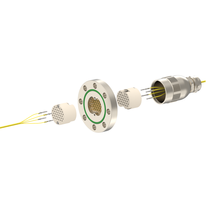 lPlugs are provided on both the vacuum and atmospheric sides, allowing easy plugging/unplugging for simple assembly and wiring. The plugs feature a keyed (polarized) design to prevent misinsertion and are made of low‑outgassing materials, making them suitable for high‑voltage (HV) environments.