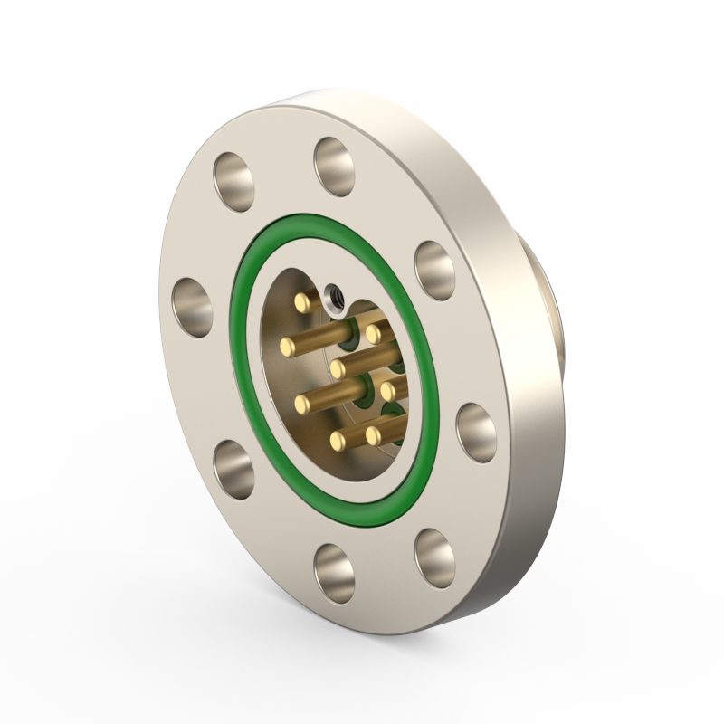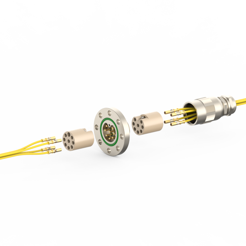 lPlugs are provided on both the vacuum and atmospheric sides, allowing easy plugging/unplugging for simple assembly and wiring. The plugs feature a keyed (polarized) design to prevent misinsertion and are made of low‑outgassing materials, making them suitable for high‑voltage (HV) environments.