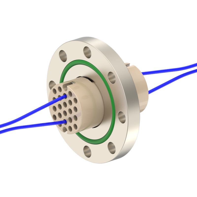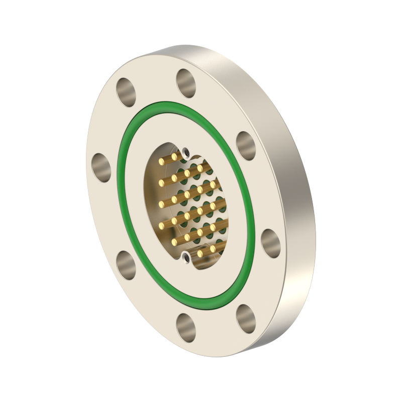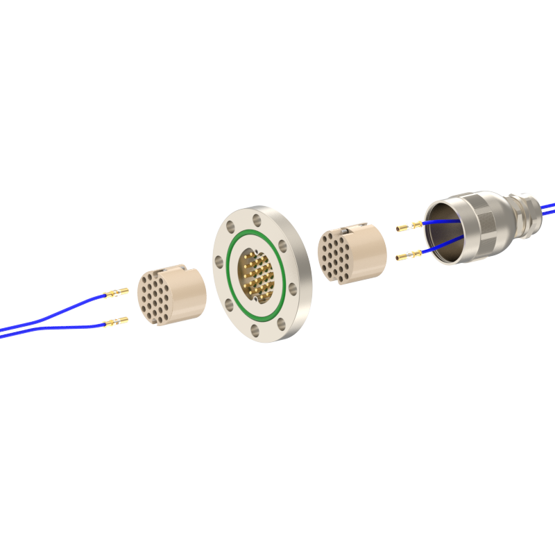 lPlugs are provided on both the vacuum and atmospheric sides, allowing easy plugging/unplugging for simple assembly and wiring. The plugs feature a keyed (polarized) design to prevent misinsertion and are made of low‑outgassing materials, making them suitable for high‑voltage (HV) environments.